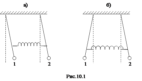 Существенно более сложными являются колебания системы двух одинаковых маятников, связанных между собой слабой пружиной, как это показано на рис. 10.1. Маятники будут участвовать в коллективных колебаниях, вид которых зависит от мгновенной разности фаз смещений маятников (относительная фаза).