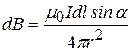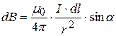 Здесь – величина индукции магнитного поля, созданного током I, текущим по элементарному участку проводника длиной dl. При этом элемент тока создает магнитное поле с индукцией: