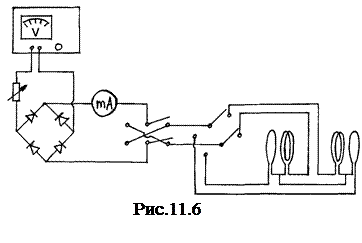Экспериментальная установка состоит из прибора, названного тангенс-гальванометром, источника постоянного тока и амперметра. Принципиальная электрическая схема установки представлена на рис. 11.6.
