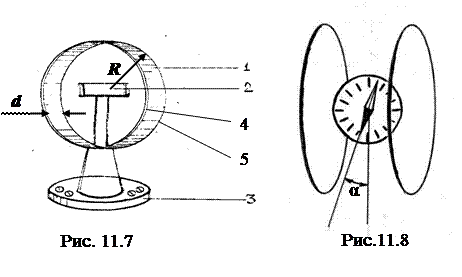 Тангенс-гальванометр (рис. 11.7, 11.8) состоит из двух параллельных тонких катушек 1, находящихся на расстоянии d друг от друга. На каждой из катушек радиусом R намотано N витков медного провода. Катушки вертикально закреплены на подставке 3. На этой подставке в центре между катушками установлена буссоль 2. Буссоль представляет собой прибор, в котором на острие иглы установлена магнитная стрелка. Под стрелкой находится шкала, по которой производится отсчет угла поворота стрелки.