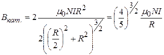 Суммарное магнитное поле двух катушек в центре между катушками на их оси при d=R получим из (11.11) при :