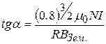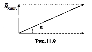 где N – число витков каждой катушки. Поле направлено по оси катушек. Прибор устанавливают таким образом, чтобы ось катушки была перпендикулярна линиям индукции горизонтальной составляющей магнитного поля Земли. В отсутствие тока в катушках магнитная стрелка устанавливается по направлению вектора ВЗем горизонтальной составляющей магнитного поля Земли (рис.11.9). При включении тока к полю Земли добавляется поле катушки (11.12); в этом случае магнитная стрелка установится вдоль направления вектора индукции результирующего поля , то есть стрелка повернётся на угол α (рис.11.8 и 11.9).