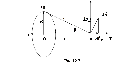 При сложении составляющих магнитного поля , перпендикулярных оси ОА, они компенсируют друг друга вследствие симметрии контура. Поэтому результирующая индукция магнитного поля в точке А направлена вдоль оси кругового тока и равна по модулю: