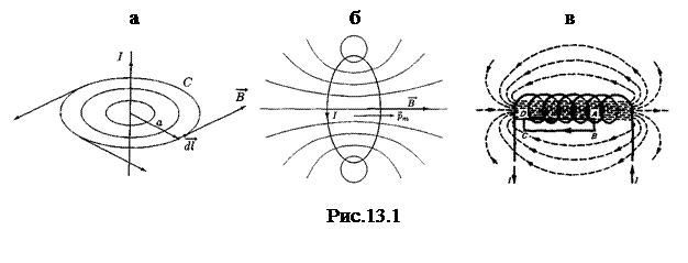 На рис.13.1 показан вид линий магнитной индукции простейших магнитных полей – поля прямого проводника и соленоида. Видно, что линии магнитной индукции охватывают проводник с током, создающий поле. Вблизи проводника они лежат в плоскостях, перпендикулярных проводнику. Направление линий индукции определяется по правилу правого винта (буравчика): если ввинчивать буравчик по направлению вектора плотности тока в проводнике, то направление движения рукоятки буравчика укажет направление линий магнитной индукции.