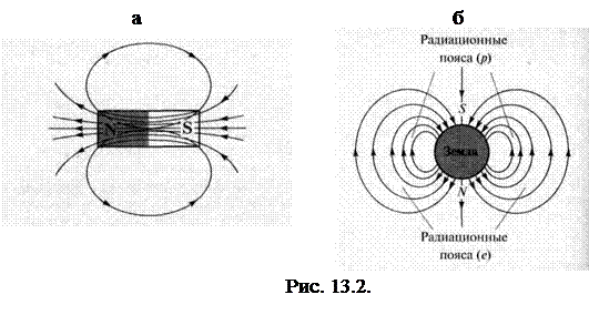 На основании опыта установлено, что разноименные полюса притягиваются, одноименные отталкиваются. В этом смысле взаимодействие магнитов похоже на взаимодействие заряженных тел. Поведение стрелки компаса означает, что существует земной магнетизм, подобно тому, как существует гравитационное поле Земли, обусловленное ее массой. Поскольку обращаемый к северу конец стрелки назвали северным полюсом, а притягиваются разноименные полюса, то вблизи северного географического полюса Земли находится южный магнитный. Иными словами, магнитное поле Земли (вне Земли) направлено с географического юга на север (рис. 13.2.б).