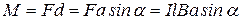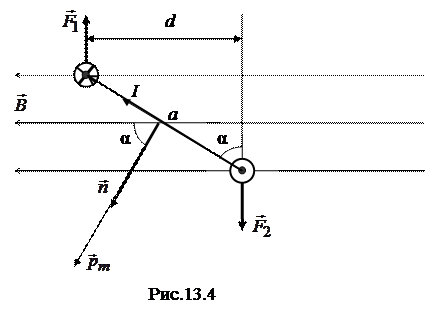 Пусть прямоугольный контур с током помещен в магнитное поле (рис.13.4). Силы, действующие на стороны рамки длиной а, лежащие в плоскости рисунка, равны друг другу и направлены в противоположные стороны по одной прямой, перпендикулярной плоскости рисунка, так что полностью уравновешивают друг друга. Стороны, имеющие длину l, перпендикулярны , так что на каждую из них действует сила Ампера, равная F=F1=F2=IlB. Эти силы противоположны по направлению, но не направлены вдоль одной прямой, они стремятся повернуть контур таким образом, чтобы его плоскость стала перпендикулярна (при этом единичный вектор нормали к контуру станет параллелен , угол между нормалью и станет равным нулю: α=0; это – положение равновесия рамки). Момент пары сил и равен