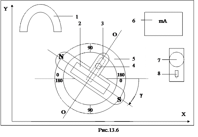 На датчике установлен компас 4, который показывает направление линий индукции поля постоянного магнита. Датчик закреплён на подставке 5, поворачивающейся на вертикальной оси, проходящей через центр рамки. Основание датчика имеет шкалу, разделенную на 360 градусов. По шкале производится отсчёт угла поворота датчика γ относительно оси OX.