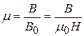 где χ – коэффициент пропорциональности, называемый магнитной восприимчивостью вещества. Магнитные свойства вещества характеризуются также магнитной проницаемостьюμ, показывающей, во сколько раз индукция магнитного поля в веществе (В) больше, чем в вакууме (В0):