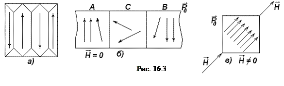Между доменами А и В имеются переходные слои С (рис. 16.3, б) шириной lперех.=10-9…10-8 м. Внутри переходного слоя магнитные спиновые моменты ионов поворачиваются до тех пор, пока не примут нужного направления. Во внешнем магнитном поле переходные слои разрушаются. Магнитные моменты отдельных доменов поворачиваются в направлении магнитного поля (рис. 16.3, в).