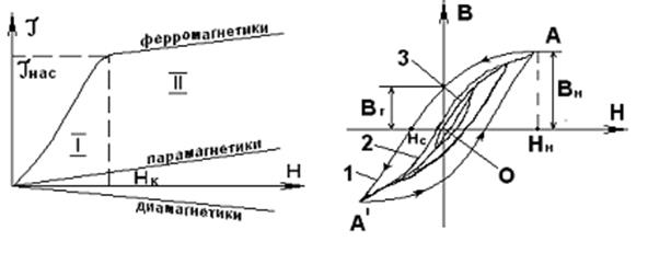 Зависимость намагниченности J магнетиков от напряженности Н внешнего магнитного поля изображена на рис. 16.4. Нелинейная область I отражает процесс ориентации доменов в ферромагнетиках в направлении внешнего поля при возрастании напряженности Н. В сильных полях (область II) наступает магнитное насыщение, и намагниченность практически не зависит от напряженности поля Н. Кривая зависимости намагниченности от напряженности магнитного поля носит название основной кривой намагничивания. Для пара- и диамагнетиков зависимость линейная.