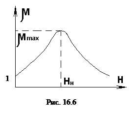 Это состояние называется остаточным магнетизмом. Напряженность (–НС), при которой исчезает остаточная намагниченность (В=0, Н=–НС), принято называть коэрцитивной силой. Если при циклическом намагничивании Hmax≥Hc, то мы получаем максимальную петлю гистерезиса 1. Кривые 2 и 3 – это частные циклы, когда Hmax<Hc. Максимумы В и Н частных циклов лежат на основной кривой намагничивания ОА. Условно принято считать ферромагнетики магнитожесткими, если А/м. Если А/м, ферромагнетики считаются магнитомягкими. Магнитная проницаемость μ ферромагнетика зависит от напряженности магнитного поля Н (рис. 16.6). Магнитная проницаемость достигает максимума, когда напряженность Н внешнего поля становится равной напряженности Нн, при которой домены максимально ориентируются по направлению поля (рис. 16.3, в) и при этом достигается магнитное насыщение образца. В табл. 16.1 приведены характеристики некоторых ферромагнетиков и ферритов.