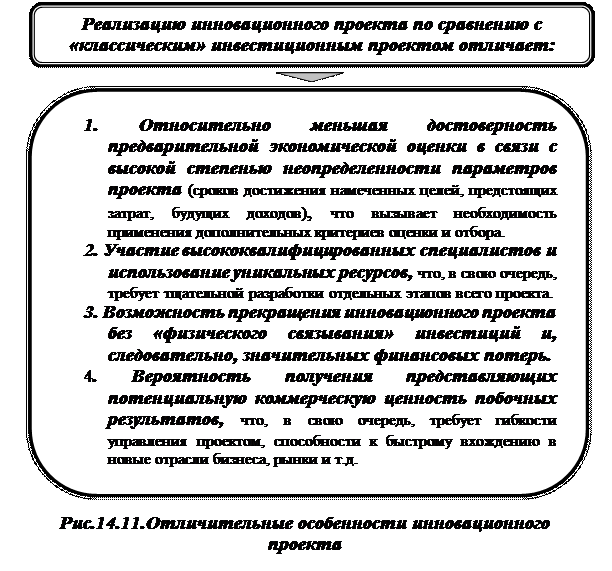 Инновационный проект по существу является инвестиционным, осуществление которого требует долгосрочногосвязывания основныхматериальных и финансовых средств. Однако по сравнению с «классическим» инвестиционным проектом реализацию инновационного отличает: