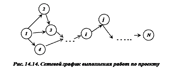 Для построения такого графика планируемый комплекс работ изображается в виде ориентированного графа — схемы, состоящей из заданных точек (вершин), соединенных направленными линиями (ребрами) (рис. 14.14). Вершины графа — события — результаты выполненных этапов работ. Ребра графа — работы — любые действия в рамках программы, приводящие к достижению определенных событий.