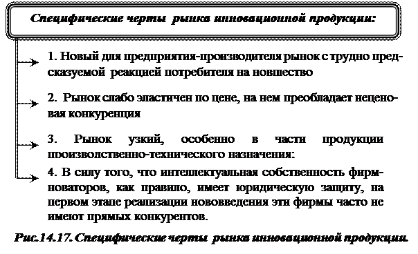 В силу уникальности научно-технической и инновационной продукции и неопределенности спроса на нее предложение на рынке инновационной продукции должно быть активным и упреждающим. Можно выделить специфические черты такого рынка: