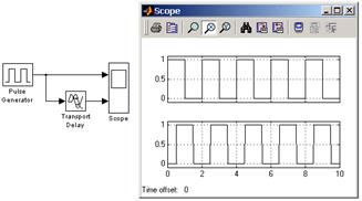 На рис. 13 показан пример использования блока Transport Delay для задержки прямоугольного сигнала на 0.5 с.