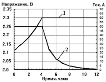 1. Содержание в режиме “плавающего заряда”, то есть превышение напряжения выпрямителя содержания над ЭДС АБ при любых изменениях этой ЭДС должно быть равно 0,14 В/элемент. Последнее равно напряжению поляризации кислотного аккумулятора. Величина ЭДС ЗНА и герметичных аккумуляторов различна. У герметичных она выше за счет более высокой концентрации электролита. Поэтому напряжение “плавающего” заряда в нормальных условиях равно ЭДС + напряжение поляризации = 2.14+ 0.14 = 2.28В/элемент. Динамика заряда приведена на рис.12. На рисунке обозначено: 1 – кривая напряжения, 2 – кривая тока (величина тока принята условно).