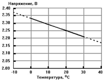 3. Требуется температурная компенсация напряжения “плавающего заряда”. Понижение напряжения “плавающего заряда”, как и понижение температуры, ведут к саморазряду и уменьшению гарантированного времени разряда до конечного напряжения. На рисунке 13 приведена типичная зависимость напряжения “плавающего заряда” от температуры, поддерживаемая выпрямителем содержания.