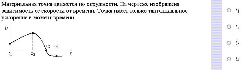 18. Материальная точка движется по окружности. На чертеже изображена зависимость ее скорости от времени. Точка имеет только тангенциальное ускорение в момент времени…