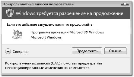 Начнем с архивирования. Нажимаем кнопку «Архивировать файлы». Как, вы еще не привыкли? Все действия в Windows Vista, связанные с потенциально опасными возможностями, необходимо подтверждать – да, это я запустил, можно продолжать…