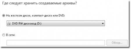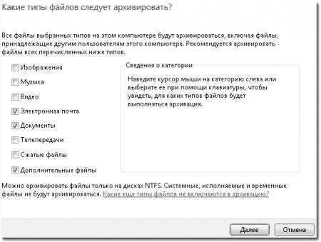 Помимо жестких дисков, в качестве устройств, на которых можно сохранить архивные файлы, могут выступать устройства записи CD и DVD дисков, флэш-накопители USB и сетевые папки. Далее необходимо выбрать тип файлов, которые необходимо архивировать.