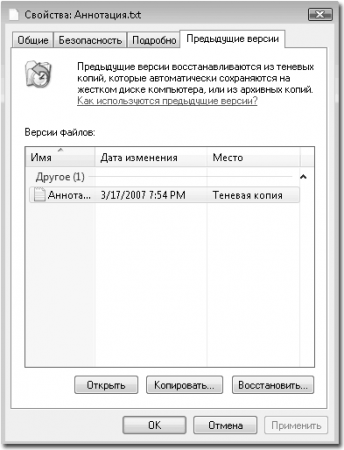 Для восстановления файлов достаточно нажать соответствующую кнопку, указать архив и следовать указаниям мастера восстановления. Вообще, процесс архивирования и восстановления в Windows Vista значительно упрощен по сравнению с предыдущими версиями этой ОС. Также следует отметить встроенное автоматическое сохранение более ранних версий файлов. В Windows Vista Business появилась функция теневого копирования томов, с помощью которой пользователь может возвращаться к более ранним версиям файлов. При этом автоматически создаются копии файлов, с которыми работает пользователь. Эти копии сохраняются для возможности отката на более раннюю версию файла. Теперь даже при внесении изменений и сохранении файла, можно вернуть его в предыдущее состояние.