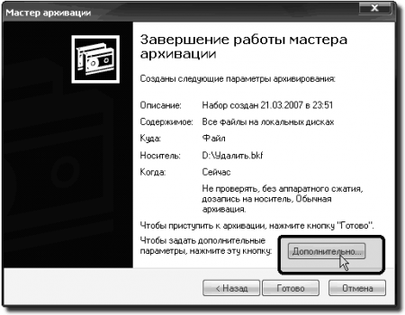 Для начала выполним резервное архивирование всей системы – создадим «базу» для возможного последующего восстановления. Запустим программу архивации. На странице приветствия, если программа выполняется не в режиме мастера, выбираем «Мастер архивации». Выбираем режим «Архивировать все файлы на этом компьютере». Нажимаем кнопку «Далее». Указываем размещение файла архива. На странице завершения работы мастера нажмем кнопку «Дополнительно».