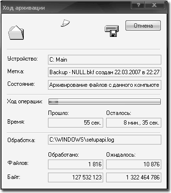 Длительность процесса архивации будет зависеть от объема находящихся на дисках данных. Для примера, процесс архивирования почти «чистой» Windows XP занимает около 8 минут. В результате работы система, занимающая на диске 1,82ГБ, пакуется в файл размером 1,24ГБ. Если учесть, что в архив не включаются файл подкачки (в моем примере – 550МБ) и прочий «мусор», то, как и говорилось выше, возможность сжатия данных практически отсутствует. Плюсом же отсутствия сжатия является довольно высокая скорость завершения операции. Впрочем, ничто не мешает воспользоваться, например WinRAR’ом, который в обычном режиме сожмет за 15 минут файл архива с 1,24ГБ до размера 507МБ. Также хочу еще раз напомнить, что наиболее целесообразно хранить созданные архивы отдельно от компьютера, на котором они созданы.