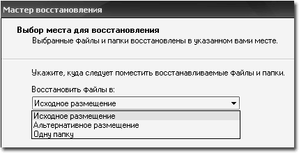 На последней странице мастера нажимаем кнопку «Дополнительно». Мне необходимо восстановить файл в прежнем, неизмененном состоянии, поэтому в выборе места я указываю – «исходное размещение»,
