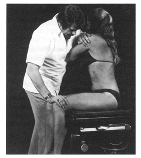 Пациент сидит, поднять правое колено к левому плечу (средняя ягодичная, широкая фасция и косая м. живота поперечная). Положите руку пациента крестом на груди, и толкните в противоположные стороны колено и плечо.