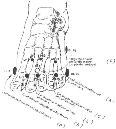 У трёх комплексов походки есть меридианные точки, расположенные поперёк тыла стопы. Аддукторы бедра и плеча имеют точки, расположенные латерально по отношению к пятой метатарзальной кости, тогда как у экстензоров плеча и бедра точки расположены близко к метатарзофаланговому суставу большого пальца стопы с медиальной стороны. Точки m.psoas major и m.pectoralis major расположены на подошвенной поверхности стопы.