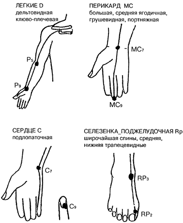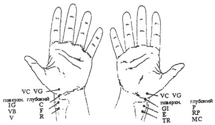 7. Определение на точках пульса меридиана с недостатком энергии. Врач производит своей рукой последовательно терапевтическую локализацию на точке