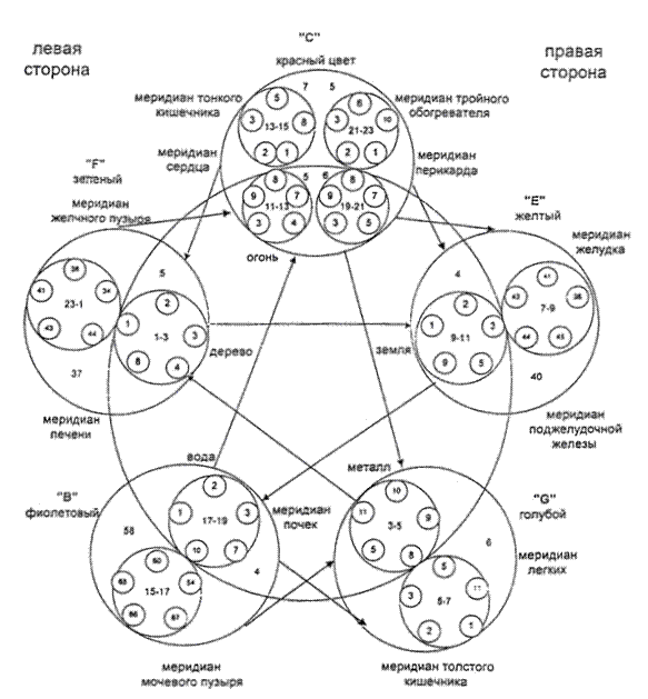 • найти в маленьком круге цифру - она указывает на порядковый номер точки акупунктурного меридиана с избытком энергии, на который необходимо воздействовать для восстановления меридианного баланса