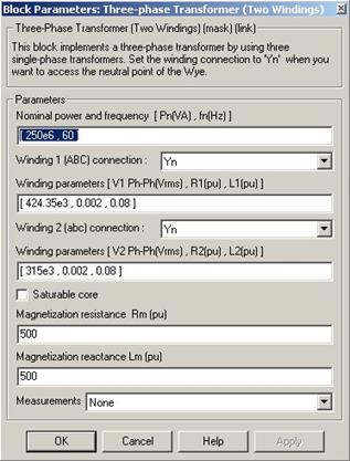 Параметри блоку Three-phase Transformer (Two Windings) наведені в таблиці 3.2, а вікно параметрів зображено на рисунку 3.2.