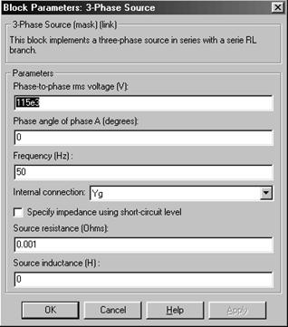 Рисунок 3.8 – Вікно параметрів блоку 3-Phase Sourсe для досліду короткого замикання