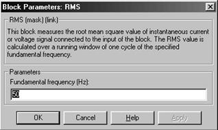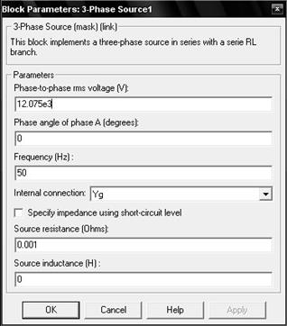 Для перевірки правильності розрахунку параметрів схем заміщення двохобмоткового трансформатора марки ТДН-10000/110 (див. приклад 3.1) проведемо досліди холостого ходу та короткого замикання. Для проведення досліду холостого ходу зберемо модель, зображену на рисунку 3.5. Розраховані параметри трансформатора марки ТДН-10000/110 задаються у вікні параметрів блоку Three-phase Transformer (Two Windings) (див. рисунок 3.3). Вікна параметрів блоку джерела живлення 3-Phase Sourсe та блоку RMS зображені на рисунку 3.6.