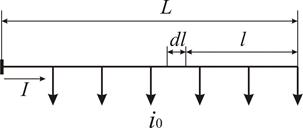У випадку рівномірно навантаженої лінії через ділянку dl, протікатиме струм навантаження (див. рисунок 4.1). Втрата напруги на цій ділянці [3]: