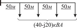 Приклад 4.1 Розрахувати втрати активної та реактивної потужностей та напруги в лінії електропередачі, яка виконана проводом марки АС-50, напругою 0,38 кВ з рівномірно розподіленим навантаженням (рисунок 4.2).