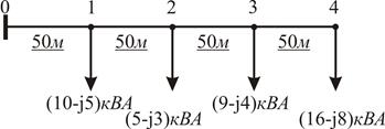 Приклад 4.3 Розрахувати втрати активної та реактивної потужностей та напруги на ділянках електричної мережі, виконаної проводом марки АС-50, напругою 0,38 кВ з нерівномірно розподіленим навантаженням (рисунок 4.4).