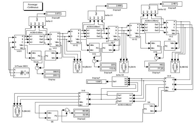 Зберемо модель електричної мережі напругою 0,38 кВ з нерівномірно розподіленим навантаженням в пакеті MATLAB (рисунок 4.6). Після запуску схеми отримуємо результати представлені на рисунку 4.6 та зведені до таблиці 4.3.