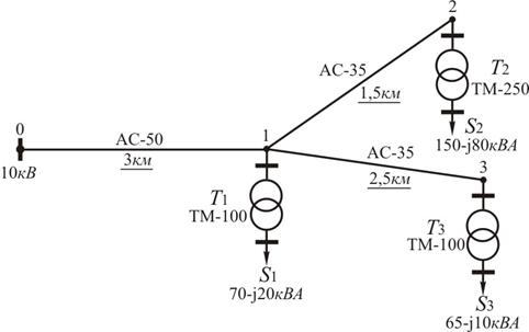 Приклад 5.1 Для схеми розподільної мережі напругою 10 кВ, зображеної на рисунку 5.1, визначити втрати активної та реактивної потужності в лініях та трансформаторах.