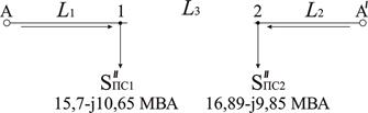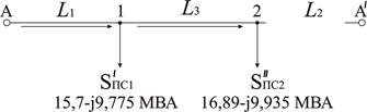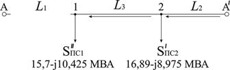 У разі аварійного відключення лінії розрахункова схема буде мати вигляд, зображений на рисунку 6.11. Потокорозподіл для цієї мережі знаходиться відповідно до першого закону Кірхгофа.