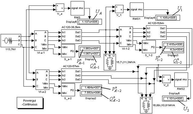 Зберемо модель кільцевої мережі напругою 110 кВ в пакеті MATLAB (рисунок 6.14), для чого використаємо створену у лабораторній роботі №2 універсальну модель лінії. Після запуску процесу моделювання режиму створеної моделі електричної мережі отримуємо результати, зображені на рисунку 6.14.