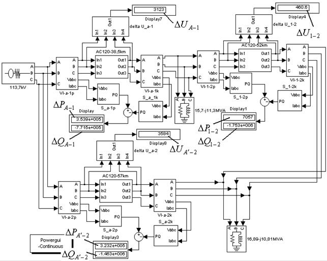 Для вимірювання втрат потужності на ділянках та втрат напруги зберемо модель, зображену на рисунку 6.15. Для вимірювання втрат напруги (алгебраїчної різниці напруг) використовується блок з лабораторної роботи №5 (див. рисунок 5.9). Після запуску процесу моделювання режиму електричної мережі отримуємо результати, представлені на рисунку 6.15. Отримані значення втрат потужностей та напруги на ділянках мережі зводимо в таблицю 6.6.