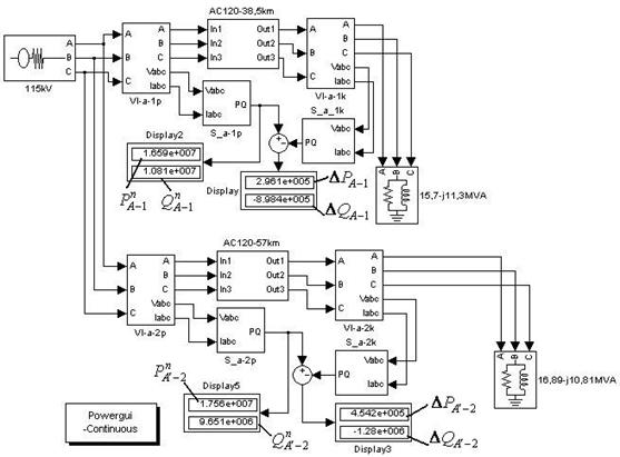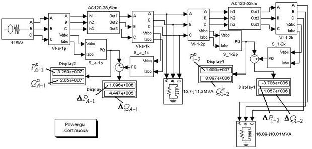 Модифікуючи в пакеті MATLAB модель кільцевої мережі напругою 110 кВ, яка приведена на рисунку 6.15 (почергово відключаючи одну з ліній) отримаємо потокорозподіл та втрати потужностей на ділянках для трьох можливих варіантів. На рисунку 6.16 зображено модель мережі з результатами моделювання при відключення ділянки