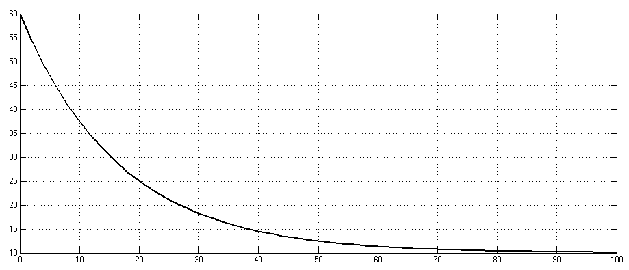 Далее добавляем блок Scope (раздел Sinks) для отображения зависимости T(t)), задаем время расчета (моделирования)