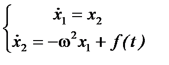 где ω - циклическая частота, х - смещение колеблющейся материальной точки от положения равновесия, f(t) - вынуждающая сила, отнесенная к массе колеблющегося тела. В качестве компонентов вектора состояния выберем