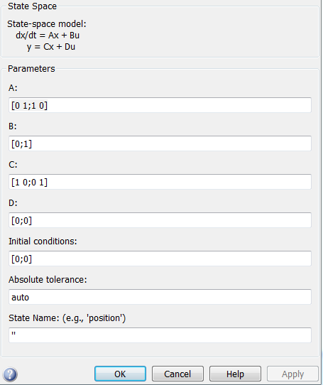 В SimuLink для моделирования систем, представленных в пространстве состояния существует блок State-Space. В окне редактирования блока State-Space приняты следующие обозначения :