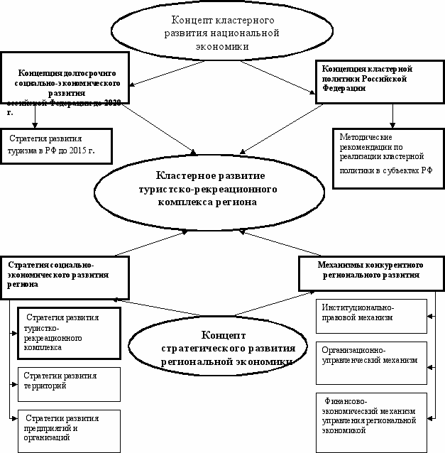 Матрица «Концепция кластерного развития национальной экономики» включает Концепцию долгосрочного социально-экономического развития Российской Федерации, кластерную политику регулирования, определяющую общие цели и задачи, направления деятельности государства и бизнеса по формированию конкурентоспособных кластеров, а также Стратегию развития туризма в РФ. «Концепция стратегического развития региональной экономики» содержит стратегию социально-экономического развития региона, нацеленную на повышение качества жизни населения и стратегическую конкурентоспособность региона, стратегию развития туристско-рекреационного комплекса региона, а также институционально-правовой, организационно-управленческий и финансово-экономический механизмы реализации стратегий. При наложении двух матриц и должны формироваться проектируемые состав и структура, стратегические альтернативы и особенности формирования туристско-рекреационного кластера конкретного региона.