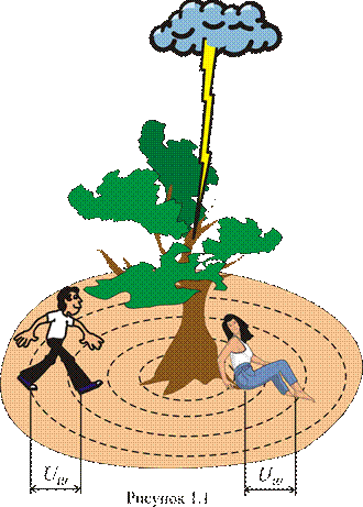 Это объясняется тем, что во время удара молнии потенциал в земле распространяется от максимального значения (в точке удара молнии) до очень малых величин (на расстоянии десятков метров) (рисунок 1.2). Человек, касаясь земли в двух разных точках, попадает под разность потенциалов этих точек, под так называемое «шаговое напряжение».