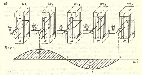 На рисунок 1.18 показан принцип получения переменного тока путем вращения рамки в магнитном поле.